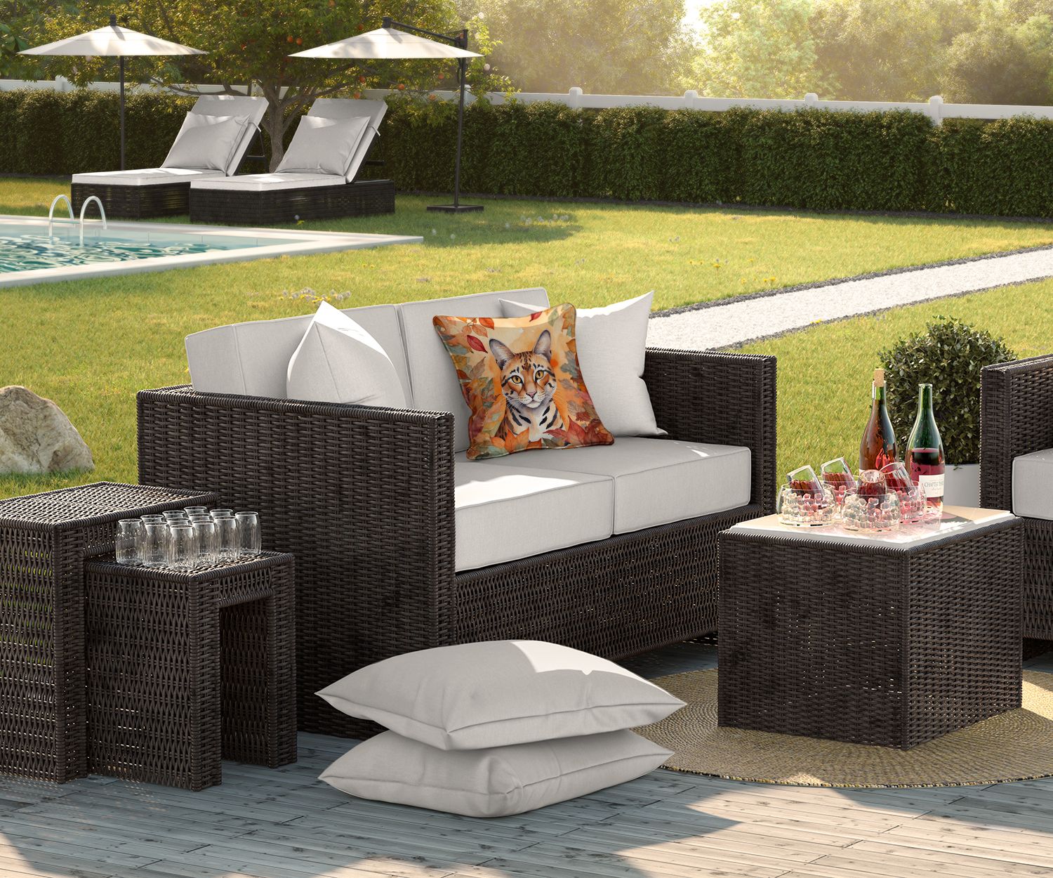 Throw Pillow featuring breed specific Safari Cat artwork. Celebrate Halloween with this Halloween Pillow. Revitalize your outdoor or indoor living space with Caroline's Treasures 18x18 Fabric Decorative Pillow. With a generously sized dimension of approximately 18 inches by 18 inches, this pillow makes a comfortable and aesthetic addition to any seating area. Made from a unique, water-resistant material developed by Caroline's Treasures, the pillow sham is 100% polyester fabric that's durable and ready to weather any condition. Its vibrant, full-color artwork will not fade over time as it is dyed with color-fast dyes. Whether you place it on your patio furniture, porch, veranda, or indoor couch, its soft canvas fabric ensures a cozy experience. The pillow is handcrafted in the United States, featuring a sham created from three pieces of fabric and a polyester insert for enduring shape and overstuffed comfort. Despite being robustly built to endure the outdoors, it is as soft and snug as your favorite indoor cushions. Please note, as all our pillows are handmade, sizes may vary slightly, adding to the charm of this unique decorative item.