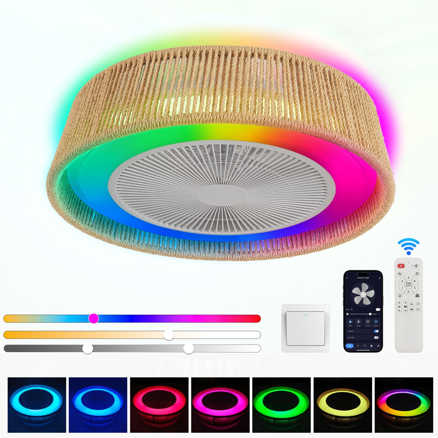 Modern Rustic Ceiling Fan Light with LED RGB Mood Lighting, Rope Woven Design, Quiet FanMaterial: Iron + Copper + Hemp Rope + ABSColor: WhiteLight Source Type: LED RGBBrightness Adjustment: Support DimmingInstallation Mode: Ceiling MountedPower Supply Mode: Hard-wiredSupport Control: Remote Control / APPColor Temperature: 3000K-4000K-6000KColor Rendering Index: 80Wattage: 29WVoltage: 110V